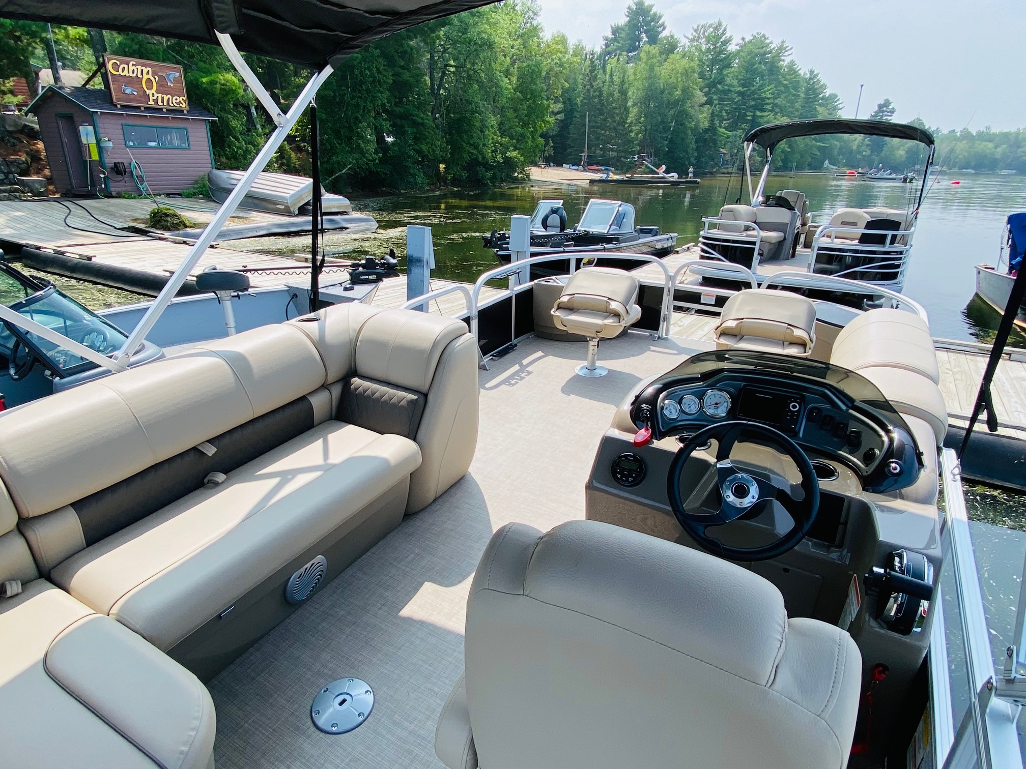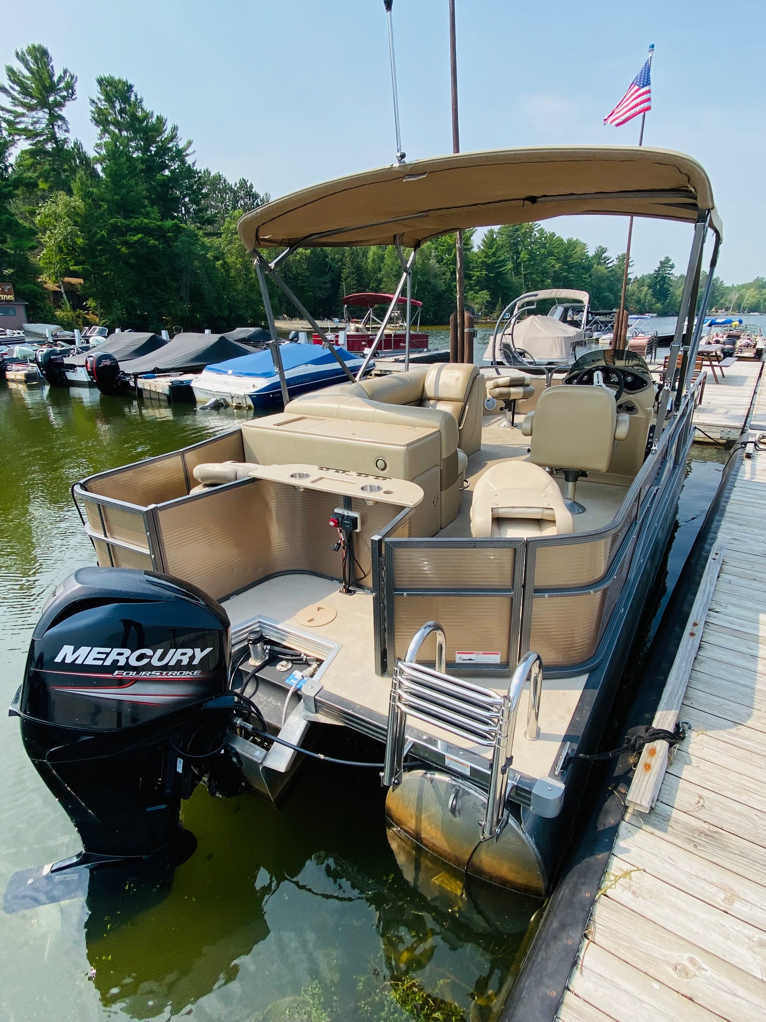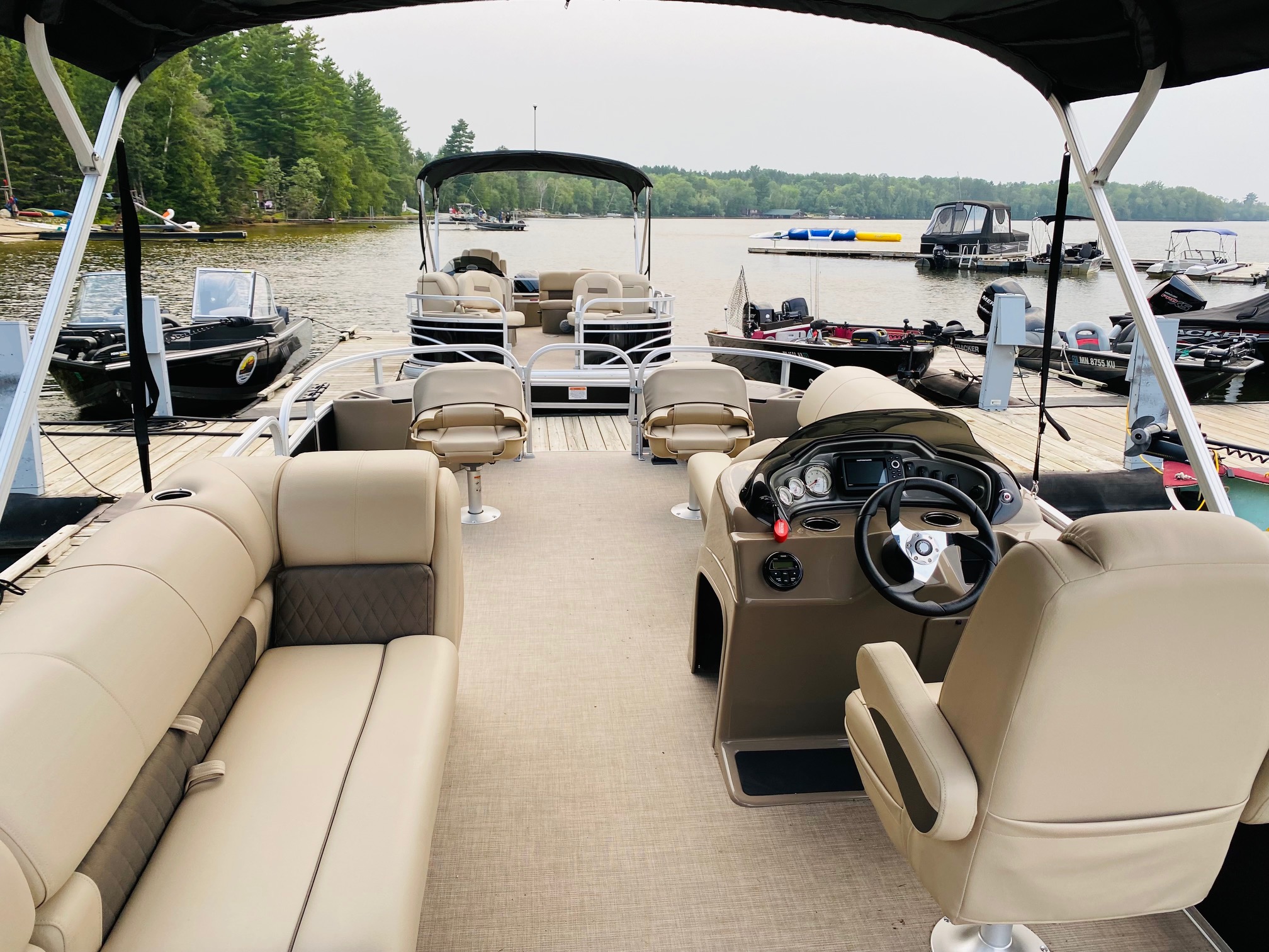 Relax and explore the lake with ease on our spacious pontoons, perfect for family outings, fishing trips, or a leisurely cruise. Each pontoon features console steering, a depth finder, and a live well for anglers. Enjoy the ride with a full surround sound stereo system with MP3 input, four comfortable pedestal seats, and a lounge couch with a lunch table—ideal for soaking up the sun or sharing a picnic on the water. Powered by a quiet and efficient Mercury four-stroke outboard, our pontoons are designed for both relaxation and adventure. Life jackets, an oar, anchor, and tie ropes are included.