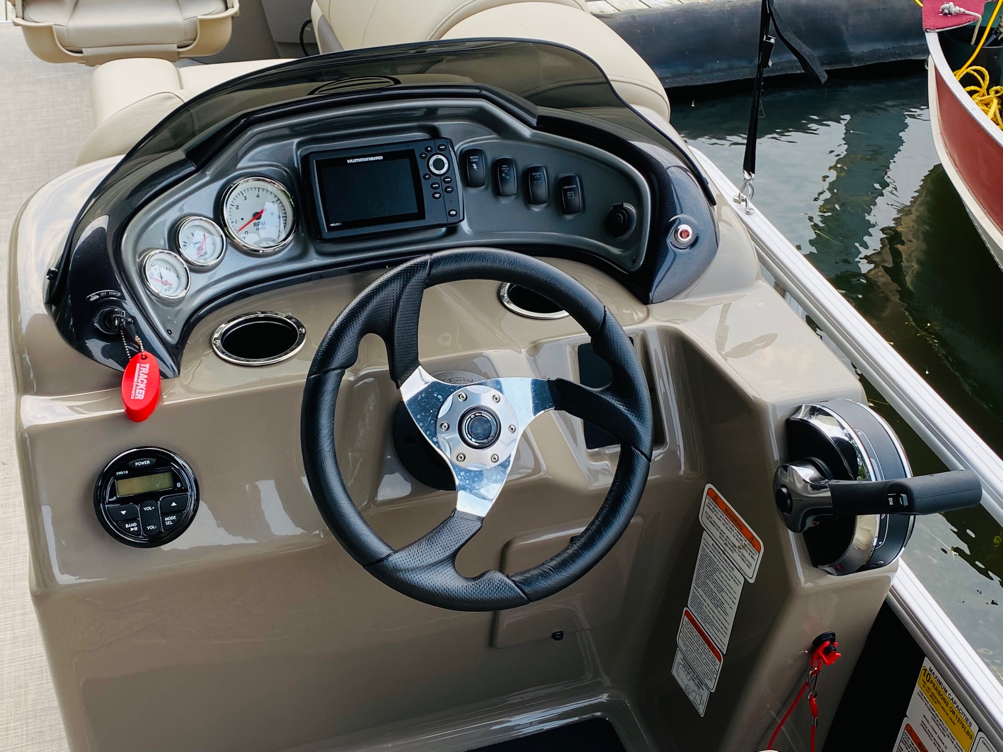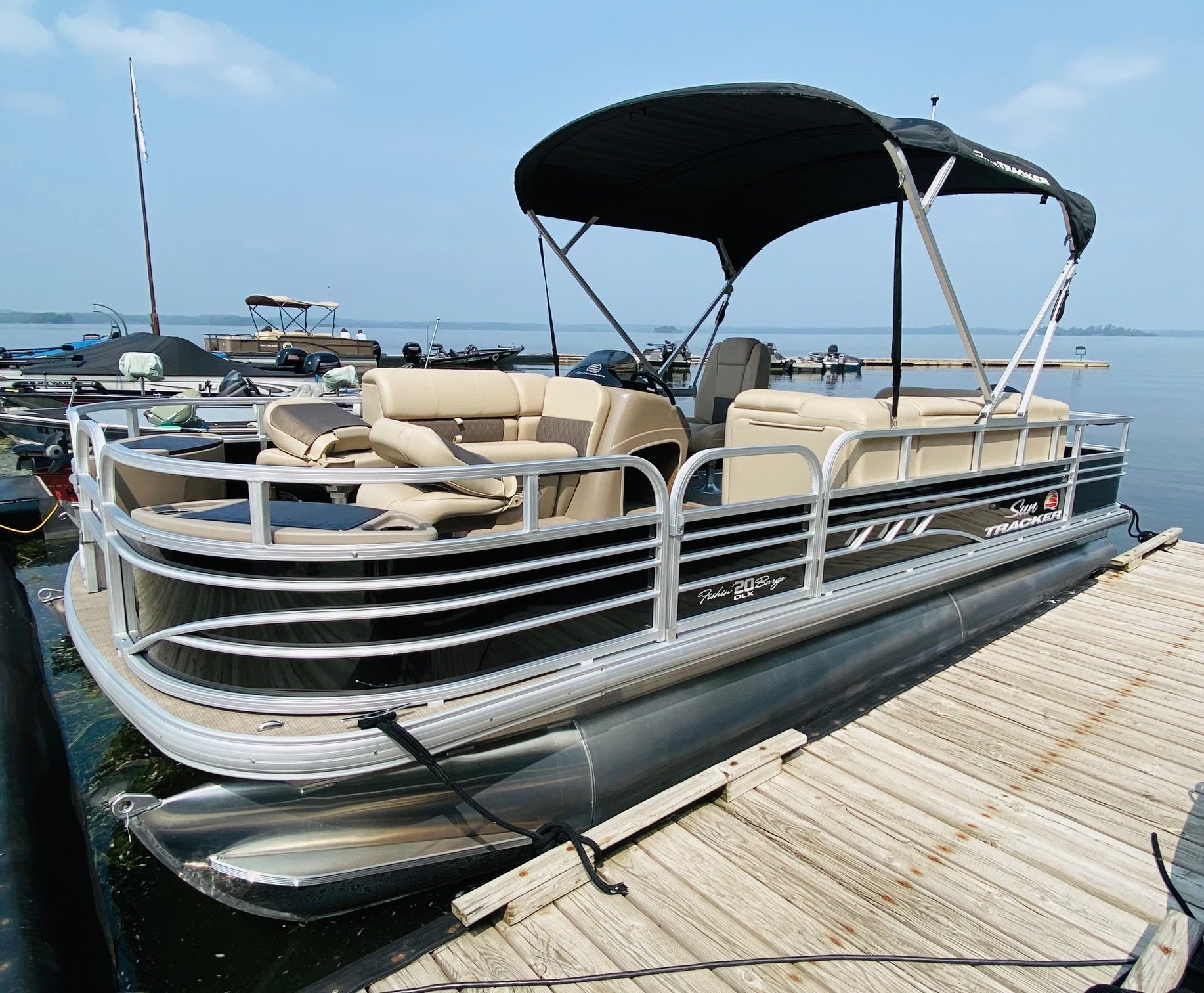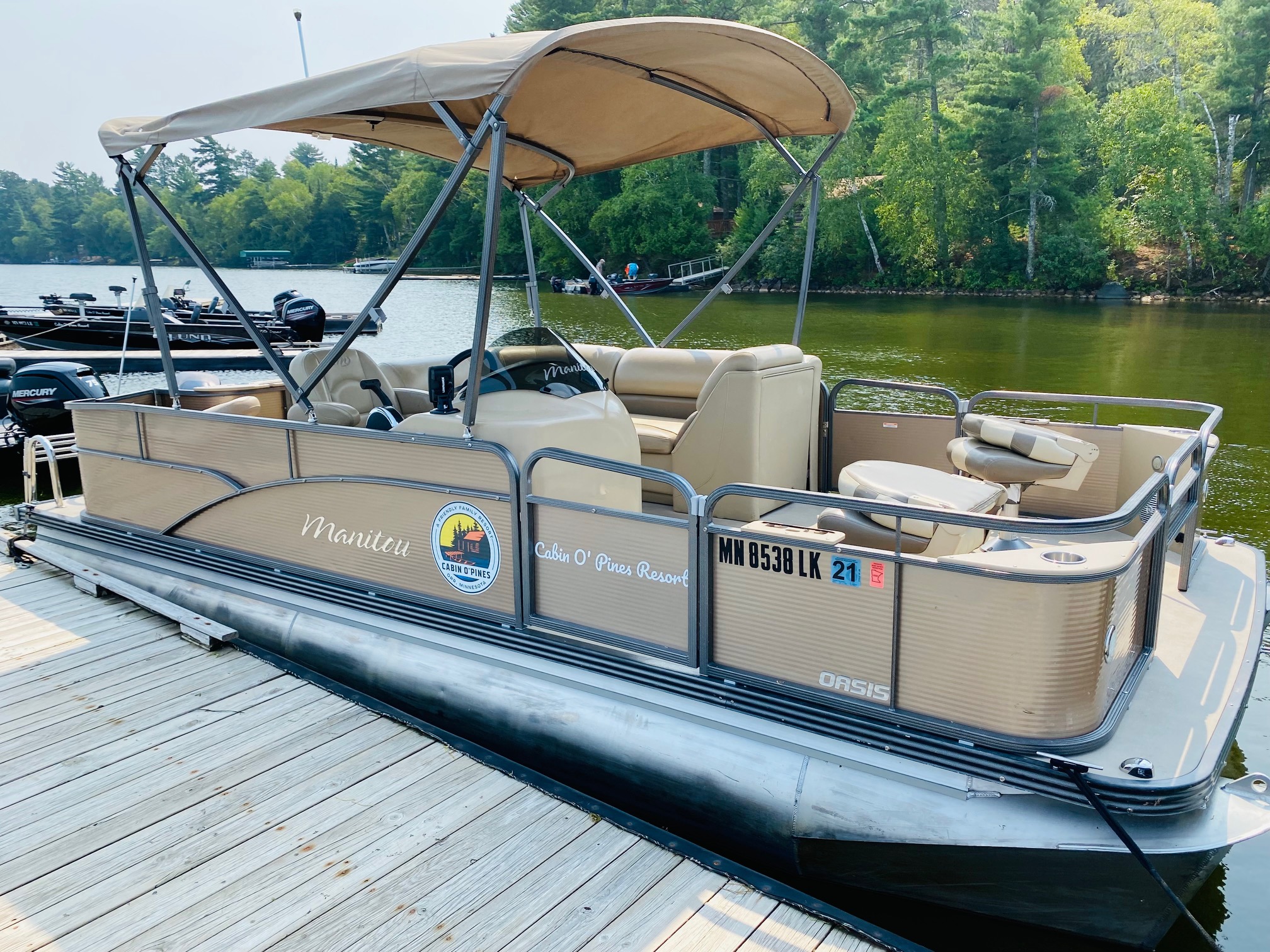 Relax and explore the lake with ease on our spacious pontoons, perfect for family outings, fishing trips, or a leisurely cruise. Each pontoon features console steering, a depth finder, and a live well for anglers. Enjoy the ride with a full surround sound stereo system with MP3 input, four comfortable pedestal seats, and a lounge couch with a lunch table—ideal for soaking up the sun or sharing a picnic on the water. Powered by a quiet and efficient Mercury four-stroke outboard, our pontoons are designed for both relaxation and adventure. Life jackets, an oar, anchor, and tie ropes are included.